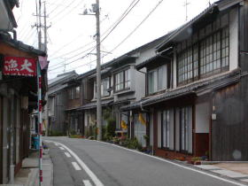 | 赤碕町(近年まで赤崎村)は鳥取県の中央部やや西寄りの日本海岸の町である。中世からの古い港町であり、泊・橋津・由良などと並び藩港として栄えた。藩米をはじめ近隣で産出される木綿をはじめとする産物が菊港と呼ばれたここより積出され大坂の中ノ島にある鳥取藩の大坂御蔵へ向った。藩倉も多く存在し、海岸に沿い建てられたことから「灘御倉」と呼ばれたという。 後に陸路が発達してくると、鳥取から米子へ至る伯耆街道の宿場ともなり、京都三井店の木綿買付けを赤崎の商人を通して行うようにもなったという。 港町は日本海の海岸線に沿って、東西約1kmにわたり細長く続く。家並の間に所々路地があり日本海へと抜けている。緩やかにカーブを連ねる家並は歩いていてなかなか楽しい。 赤崎の古い港町は、山陰本線や国道9号線が山側を通過したために、江戸期以来の風情が多く保たれている。もっとも往時のままの古い町家形式の旧家が連続しているところは少ない。しかし細い格子を、一階部の出格子だけでなく二階部も全面に構え、平入りの妻部は、あるものは板塀が施され、または漆喰で塗り込められる。屋根は山陰独特の赤瓦だ。現代的な建売住宅的な家は全くなく、建築年代は新しくても全体的に古い町並の雰囲気が濃く感じられる。そしてその雰囲気は、板塀が多用されているせいもあるのだろうか、何か北国の港町のような寂寥が漂っている。町並の充実度以上に郷愁を感じさせる港町である。 最近修復されたらしい家も一部古い建築様式を守っているものもあり、住民はこの町並に対して、意識をされている色が若干伺えるが、町並散策者はもちろん、町並を案内する標識等は全くなく、ほとんど素のままの港町が残っている。 町の西側には、浜に接して広大な墓地が開け、その先に日本海が広がっている。丘から見下ろすこの風景はかなり壮大であり、異様でもある。赤碕周辺では、「埋墓」・「祀墓」を別々に祀る、いわゆる両墓制の残る地である。盆や正月は両方が祀られるが、僧は供養墓だけを拝むものである。その他この地域には独特の風習が数多く今に残ると言われており、興味深い。 |