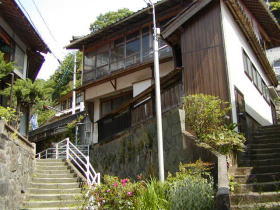 | 温泉地の少ない中国地方において、江津、浜田市周辺の山間部は比較的密度が濃いと言える。しかしいずれも有名なものではなく、山懐や田園のなかに小さな温泉街を形成している。 有福温泉は、それらの中では非常に古い歴史を持つ。江津市内ではあるが、中心からは10km以上も内陸に隔たった山間の谷間に展開している温泉街は、僅かに開ける平地に留まらず斜面にも及び、それらは細い路地、階段などで連絡されている。団体観光客を意識したビル型旅館、ブームにあやかった施設なども全くない昔ながらの出湯といった雰囲気のある貴重な温泉地である。 この温泉の歴史は1300年にも及ぶとも言われている。俗化していない温泉地を象徴しているのが、3つの共同浴場であろう。温泉街の坂の入口、三階旅館という老舗旅館の近くにあるさつき湯、そこから急坂と石段を登ったところに一際異彩を放つ古い洋風建築の御前湯、やや上流側の川沿いにあるやよい湯である。やよい湯は18世紀以来の伝統的な共同浴場だ。なお、三階旅館とは妙な名称だが、この旅館が建てられた当時、三階建て以上の旅館は存在しなかったことから名付けられたという。 有福の町並は、立体的に展開するところに味わいがある。旅館といっても通常の民家と外観はさして変わらぬ石州瓦葺の低層建築も多い。それだけに高台からの眺めは、赤瓦のひしめく湯治場といった趣も濃い。客層も若い人は比較的少なく、小人数のお年寄が目立った。温泉ブームに便乗したようなところが多い中で、貴重な昔ながらの佇まいが保たれているということで、郷愁風景として紹介する。 |