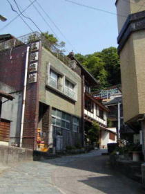 | 坂と階段だらけの狭い土地に鄙びた旅館、民家がひしめき合います。 | ここが有福温泉の表玄関。左が三階旅館。 |