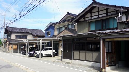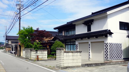 朝日町境は県の北東端、境川を挟み新潟県と接し、『郷村名義抄(越中志徴)』に、「この村、越後・越中国境に付き、則ち境村と申し伝え候」とある。北陸街道沿いの集落である。 この辺りまで来ると平野部が狭まり、飛騨山脈の北端部に相当する山塊が迫ってくる。越後に入ると親不知・子不知をはじめ険路が連なり、旅人はこの先の険しい道のりを思ったことだろう。また逆に東国からの旅客はここで難所を越えられたと安堵したことだろう。 境には加賀藩により関所(口止め番所)が置かれ、国境警備が図られていた。街道をまたぐように大門(街道御門)が置かれ、通行人は必ずこの門を潜らねばならない仕組になっていた。人や荷はここで改めまた取締りを受けた。また、この関所により町が二分されていたため、村役人は東西2箇所に置かれた。 国道はこの街道集落の部分だけ山側を迂回した形になっており、旧街道を通行する車両は少なく静かだ。旧道とは言え十分な幅があり、開放的な雰囲気を持っていた。 17世紀創業の林酒造は伝統的な構えを見せ営業中で、この杉玉のさがった老舗の付近を中心に東西に家並が連なる。西部では妻入りの建物が連続した風景もあるが、全体的には敷地に余裕があるからか、家々の立て方は主要街道の宿場町のようにぎすぎすした感じではない。 町の中心部には、かつての大門が復元されていた。案内板によると、門の山手には関所の事務所をはじめ藩主の宿泊所であった御旅屋、奉行が詰めていた御貸屋などがあったという。 |