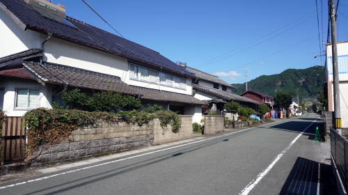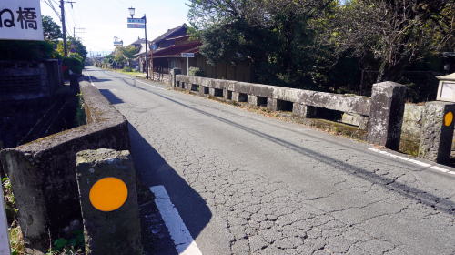 阿蘇の外輪山内の平地は北の阿蘇谷、南の南郷谷に分れ、前者の最東部に位置するところにこの坂梨がある。火山の火口部であり、南には中央火口丘群を仰ぎ見るが、付近の地形は比較的なだらかで耕作地帯が展開している。 豊後街道の宿駅として重要な位置を占めていた。熊本藩主の参勤交代時にはこの街道を通り、豊後鶴崎(現在の大分市)の港より海路に委ねるのが通例だったからで、会所や御茶屋、女改番所などが置かれた。会所は藩の設営する現在でいう役所、女改番所とは女人の出入りを取締ったものである。 この地には「大坂に坂なし、坂梨に坂あり」という俚諺がある。これは地区の東にある急坂の難所をしめしており、険しい峠路から解放される坂梨宿は、旅人が休泊するに適したところであり、また物資も集まりやすいところで各種商店も発達した。豊後方面のほか南郷谷への道も分岐し、宿場町として発展を見た。 明治24年の記録では戸数385、1,800余名の人口を有し、大正期には荷馬車、客馬車なども多く幹線交通の要衝として賑わっていたが、昭和3年に国鉄豊肥本線が開通すると、中心は宮地駅付近に移り坂梨は徐々に衰退していった。昭和10年には人口1,770名ほどと、やや減少している。 国道57号の一本南側に明確に街道筋が残り、家並は連続性こそ乏しいが街道集落らしい趣を残している。中でも目に留まるのが国道265号との交差点東にある菅家、屋号虎屋の建物である。塀に囲まれた広大な敷地を有し、街道に接して瓦ぶきの厳かな門を構える。豊後岡藩などへの両替商を行っていたほか、幕末期から明治にかけ盛んに行われた朝鮮人参の栽培、商いでも財を成した旧家である。 設置された案内板を見ると、街路の両側に何々屋と呼ばれた店舗や宿屋が連なっていたさまがわかる。現在は国道に隠れてその存在に気付くこともないところだが、偲びながら歩くと往時の情景が浮び上がってくるようである。弘化4(1857)年に竣工した石橋もそのまま使われていた。 |