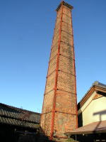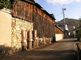 | 町中には様々なところで備前焼が目に入ります。塀の一角に埋められた土管。神社の獅子も備前焼でした。 | 登り窯が良く似合う町並です。 |