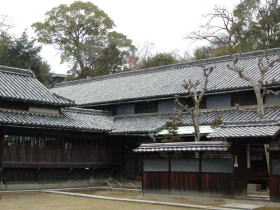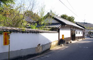 | 酒津は倉敷市街地の北端、高梁川にぶつかる位置にあり、少し上流に向えば山陽自動車道や新幹線が川をまたいでいる。 この付近よりかつて東高梁川が分流していた。現在は治水工事によりかつての河道筋は公園となり、また八箇郷用水と呼ばれる用水の取水口となっている。 郊外住宅地の様相だが古くは裕福な農村地区だったらしく敷地の広い屋敷が長屋門や土蔵を従えて残っていた。但し町並というほどは固まって残っていない。 (08.04.20) |