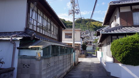 江田島町秋月地区は島の東岸、対岸には呉市の市街地と港湾地区の工場群を見渡す位置にある。付近は島の幹線道路から外れており、静かな環境にある。 島の東海岸では数少ないまとまった集落で港として古くから開けており、特に西風による波により対岸の吉浦・和庄の港に着岸できないときには、当港が避難港となったという。秋月という地名も、西風が秋に卓越することから、秋附(着)からの転訛ともいわれる。 海岸から少し歩くと狭い平地は尽き、家々は斜面上にも大きく展開する。雛壇状に家並が展開する光景はこの島では珍しいといえ、非常に特徴あるものといえるだろう。商家を思わせるような入母屋屋根の御宅も散見される。港と言っても対岸や近在の浦々との往来程度であっただろうし、他に何か生業としたものがあったのだろう。 ふと眼にした情報によると、10年ほど前まではもっと隙間なく家々が密集していたとのことで驚く。もっと早く探訪しておけば良かったとの思いを抱くが、現在の姿でも十分集落としての特徴は感じることが出来る。 なお明治以降海軍が町はずれに貯油タンクを設置するなど軍事的な土地利用が増え、現在は海上自衛隊が使用している。また地区の北側には米軍の秋月弾薬庫もある。 |