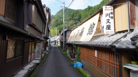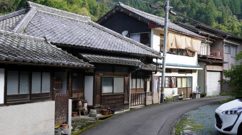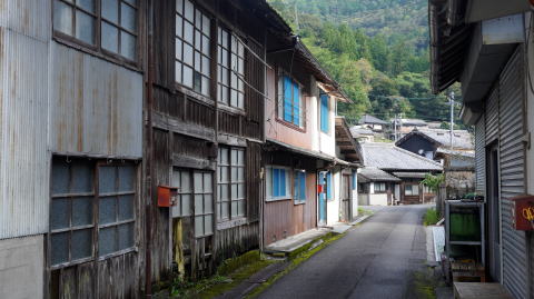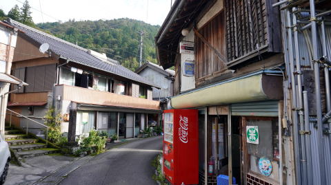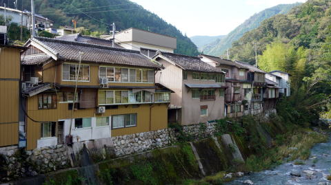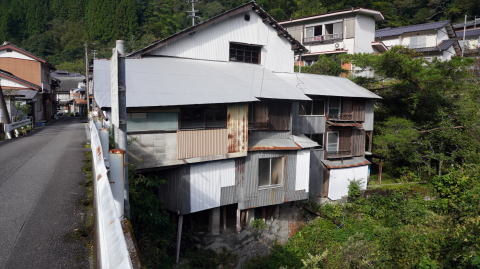 谷間の袋小路のようなところで耕地が乏しく、産業は主に林業に依っていた。その中にありこの日比原地区は物資搬出の要衝にあたっており、商業も発達した。明治5年には郵便局が開設、楮1万9000円余、木炭1万5000円弱などの物産があり、また酒などの醸造業も行われていた。小さいながらも商店が並び、周辺山村の物資供給地となっていたようだ。 すぐ北側には吉野川水系との境をなす険しい山峰が連なっており、集落付近の標高は200m余りではあるが非常に山深いところとの印象を抱く。国道から一本谷側に残る旧道に沿い家並が連なっていた。集落が発達するところとしては険しく、街路に面しては平屋や二階建てであっても、川の方向から見ると二階屋・三階屋と一段高くなっている建物も多い。中でも橋のたもとから見える崖にしがみついたような外観の建物はこの集落を象徴するようであり、情報によると路線バスの車庫として使われていたとのことだ。 歩いていると今も店として商売されているわずかな御宅以外にも、もと店舗らしく1階部分が開放的なつくりになっている家々が多く、賑わいのあるところだったのだろう。また「御旅館」の看板を掲げた建物も見られ、こちらは現場関係者などの需要があるらしく現役のようであった。 小さな集落ではあるが、狭い土地を克服しようとする家々の形、そしてかつての賑わいが伝わってくる点で印象度は強いものがあった。 |