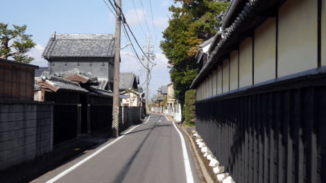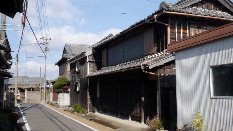 伊勢街道に沿い線状に続く町並は、隣との取合いに適度な余裕があって、都市型の町並のようにぎすぎすした感じでないのも、もともとは農村集落だったことを感じさせる。 構成する家々は独特の外観を保っていた。一部に平入りもあるがほぼ全体が妻部を街路に接した姿を示し、伊勢地方らしい板貼りの壁を持っている。一階正面には格子が綺麗に保たれていて、また軒下には幕板が見られ、側面にまで回されているものも多い。間口も全般に広く、商家としても大規模だったらしい構えが多い。全体に「木造の美しさ」を感じさせる町並である。 道筋は常に緩やかにカーブを描いていて、現代に入って開発された街路ではないことが証明される。先の風景が家々で妨げられ、歩いていくほどに妻入り町家が次々と現れてくるその風情は格別なもので、市場庄の町並を一層奥行深いものとしている。家並は南北1km以上にも連なり見応え充分である。 南側に接する久米地区にも街道に沿って立派な家々が連なっていた。家並が途切れたところに、六軒・市場庄から久米に至る街道の案内板があり、各家の屋号が示されていた。町並を構成する旧家にはそれぞれ昔の屋号を刻んだ木札が掲げられている。そのことからも地元の方はこの町並を意識した活動をされているようだ。今回16年振りの再訪であったが前回から建物が失われた様子はほとんど感じられなかった。 |