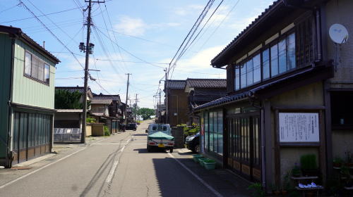 日本海沿いに長い新潟県の海岸線の最南西端、わずかな平地に市振の町並が開けている。北陸道の越後に入る振出しの位置にあるとことが地名の由来とされる。 東には難所・親不知子不知の険を控えるところであるが西国からの善光寺参りや参勤交代などの重要通行もあった。親不知では断崖の下、風波に攫われる危険をおかしながらの通行であったとされ、命がけともいえる徒歩行であった。 江戸初期には幕府が高田城主・松平光長に命じてここに市振関所が置かれた。越中との国境に接する要地として、検問としての御番所と海上の監視を行う遠見番所から成っていた。集落の西にあったその番所跡には、現在小学校の敷地となっている。 国道の海側、その小学校付近から街道集落らしい町並が展開し、800mほど家並が連なる。平入と妻入りの建物が混在し、屋根瓦は黒褐色でほぼ統一される。ただし、大正期に全村焼失に近い大火があったため際立って古い建物はない。 元禄2年には松尾芭蕉が奥の細道の旅の折ここに泊り、宿をとった「桔梗屋」で「一つ屋に遊女も寝たり萩と月」という句を詠んだ。桔梗屋のあった場所には句とその解説が案内板に示されていた。脇本陣も務めていたというこの宿は大正期の大火で失われてしまった。 |