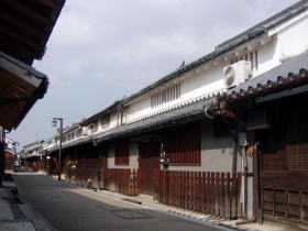 | 中世末期に、寺院の境内地の周囲に濠を巡らせ、その内部に僧侶や信徒を住まわせた町を寺内町と呼び、関西を中心に発達した。その中でこの今井は規模、現存度ともに国内最大であると言われている。寺内町は一向宗の門徒が武力を保持し、外部に抵抗するいわば要塞都市である。 寺内町としての機能は16世紀に幕を閉じたが、その後も自治権が与えられ、大阪方面との商業取引が盛んとなり、大和の一大商業都市へと変貌した。木綿産業、酒造業などの繁栄から両替商へと発展した商家もあり、大名へ金の貸出しも行われたといわれる。独自の通貨「今井札」も流通していたほどで、「大和の金は今井に七分」という言葉も生まれた。 濠はドブ川のようなものとなっているところも多いが明確に残る。しかし当時の濠は現在残っている幅の三倍ほどもあったといい、まさに要塞であった。濠の内部に入ると、それまでの都市近郊の風景から突然古い町並が展開し始めるのですぐに寺内町に入ったことを知る。何しろこの地区の8割が江戸期の建築という。中でも町の西端にある今西家住宅(国重文、春秋の指定された時期のみ公開)は、この集落の総年寄(司法権・警察権を委ねられた家)として、当時の偉容をそのまま保っている。集落内には今でも民家の裏側に、生活水の排水のための室町時代からの遺構、「瀬割」が残る。 今井は寺内町という枠を除いても、国の重要文化財に指定されている旧家が八軒もあるなど町並として全国屈指のものであるが、重要伝統的建造物群保存地区となったのは平成に入ってからと意外と遅い。しかし町の人に聞くと、強制的に保存させてもらわなくとも自分たちの手できちんと守って行くことが何よりも重要だと言われていた。例えば改築にしても、旧態を保った形でないと国の補助が出ないのである。保存地区になる以前でもこれほどまでに江戸期そのものが残っているということは、如何に住民の意識が高いかを示している。江戸の昔より大火は全く出ず、通りを歩くと屋根の上に上がって補修をする姿が見られる。ごみは全く落ちていない。 |