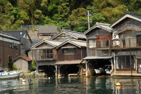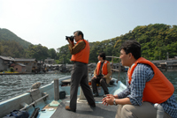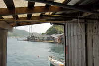 そして今回のオフ会のメイン行事は船からみる町屋探訪だ。オフ会専用掲示板で孫右衛門さんが出したアイデアが実現した企画だ。9時に宿の2,3軒先の船着場にチャーター船がやってきた。その船は通常は漁にも利用されたり、釣り人の渡し用に使われているのだろう手すりがついている。スケッチに熱中しているKさんにとって船にのる時間も惜しいのだろう。丁重に乗船にはご辞退されてスケッチポイントへむかわれた。さて残りの5名を乗せた船は船着場をはなれてゆっくり舟屋を堪能できるきょりまで近づきながら進む。いくら重伝建の歴史ある町並みの住民で見物人にはなれているといえど至近距離かの船に乗った5人のカメラマンから覗かれ写真 を撮られるのはあまり気分のよいものではないだろうなと思いつつ、すばらしい舟屋や蔵の続く海岸線の町並を堪能する。途中伊根湾の防波堤のような青島に立ち寄り鯨塚にもお参りする。ぐるりと伊根湾をまわり元の位置までもどり、途中スケッチをしているKさんを見かけて舟をよせて声援をおくる。本人ニコリと愛想笑いと手を振って応えているが内心はスケッチ制作の進行を妨げるお邪魔虫と我々5人組みのことを思っていたのかも知れない。船は再度出発地点民宿「おくの」までもどりその後歩いて町並みをみるポイントまで進めて下船した。かつては道路がなく船がメインの生活道路だった伊根を船からながめることにより、その本来のおおらかな風景を垣間見ることができたと思う。海からみた風景こそ伊根の正面玄関だったのだろう。 |