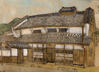 オフ会へのアクセスもいからぐみの特徴は往路と集合そして解散後の復路ルートのメンバーの行動も各様であることだ。それを決めるのもまたオフ会や町並み探訪の面白さなのだ。nomnomさんはひと足先に前日からの東京出発で京都でレンタカーを深夜に借りて鳥取へ入り仮眠をとって早朝の若桜からスタート。そのころ広島から孫右衛門さん、岡山からYasukoさんが山陽道をとばしていることであろう。一方関西からやや遅れたころ七ちょめは茨木をKさんは交野、西山遊野は京都をそれぞれ出発する。Kさんは毎回のごとく現地スケッチ派なので途中はどこへもよらず一番早く伊根へ直行すると早速ポイントをみつけて舟屋のスケッチを始める。そのころは各メンバーそれぞれのコースに従い町並み探訪を始めている。nomnomさん、孫右衛門さん、西山遊野の3人は以前のミニオフ会(但馬・丹波地方探訪)で買い求めた「町 並み探偵団」という但馬地方の養蚕とうだつの町並みを紹介した本を読みいずれこの地方を見ようとチャンスを狙っていたようだ。三人はみなそれぞれ相談なしに個別にルートを決定する。ところが全く偶然に連絡もなしに数分も狂わない精度で同じ場所(養父市場)の町並みで待ち合わせてもむりぐらいのタイミングでばったり出会う。半年振りの再会にも関わらずそれがごくごく自然で「どうも」程度のあいさつ程度で今見ている町並みの会話が始まる。毎日ようのにサイトで会話しているのでご無沙汰感は全くない。そして三人はそれぞれの次の目的地へと向かう。わたしはここでうだつの一番立派な町屋をスケッチするが途中で雨がパラついたので彩色はあきらめて出石へ向かう。そしてその出石でも孫右衛門さんとばったり辻で出会った。nomnomさんは宮津でレンタカーを返却してYasukoさんと合流して伊根に向かう。いっぽう七ちょめさん加悦町、野田川町、岩滝町、峰山町、網野町を訪ねて丹後半島を廻って伊根には北側からはいるとのこと。そして全員夕刻には宿に到着した。