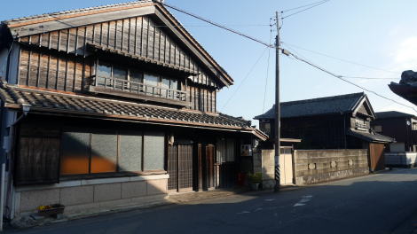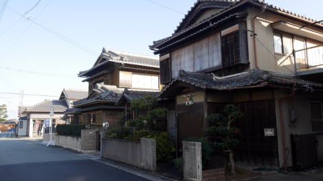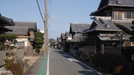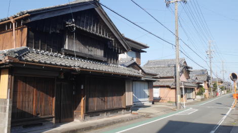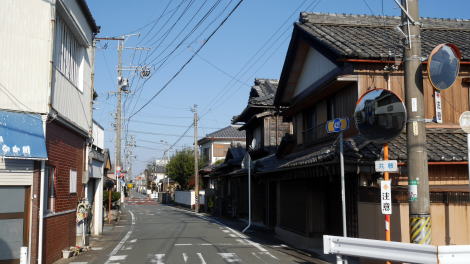 | その後小俣小学校の西を通過し、外城田川を渡ると相合(そうごう)地区に入る。バスなども通る広い通りは一本東側に造られたため、旧街道と街道集落が明確に残っている。家並はほぼ一直線に500mほど続き、連続性の高い町並景観を残していた。家屋自体はそれほど古いものではないが現代風の建物は少ない。統一性が見られるので、それぞれが比較的近い年代に建てられたもののように思われた。 参宮客が続々と往来していた頃の賑わいは如何ばかりだったろうと思わせる家並が展開していた。 |