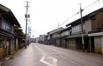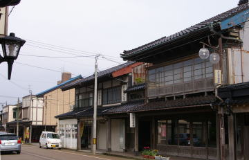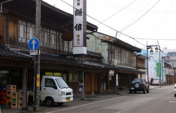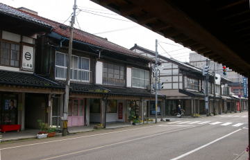 この大糸線の通る姫川の谷は近年まで重要な街道で、山国信州にとって貴重な塩や海産物を運び込む日本海側の起点はこの糸魚川であった。北前船で運ばれた物資はここで番所の検査を受け、信州問屋と呼ばれた問屋で町中で消費されるものを選別し、残りの荷物は街道を往来する人々に負われ、険しい山道に挑んでいった。険阻な道であったため牛が多く使用された。この山越えの街道筋が塩の道と呼ばれるのもそうした理由からである。 白馬通りと呼ばれる南北の通りが当時の町の中心で、この付近で信州への物資が荷造りされ、次々と運び出されていったのだろう。あちこちに牛がつながれ、慌しく出発準備をしていた情景が繰り広げられていたに違いない。付近は杉玉の下がった造り酒屋をはじめ歴史を感じさせる町並が広がっていた。 それに直交する東西の通りは商店街となっている。この界隈も古い町並と評価できる風景が連なっていた。現代風の商店はほとんどなく、間口の広く二階の立上りの高い商家建築がそのまま店舗として利用されている。印象的だったのが戸袋の意匠で、各店はそこに屋号を刻み宣伝効果を発揮させている。その姿は統一されていて、ある時期に商店街として整備されたような色が伺えた。しかしそれは最近のものではなかろう。通路も現代風のアーケードではなく、この地方独特の雁木の形を保っていた。 駅前から日本海岸に向う大通りを挟んだ東側の寺町界隈にも古い町並が続いている。恐らくこれが旧北陸道であったのだろう。ここには宿駅も設けられ本陣もあったという。街道集落らしい雰囲気を感じさせた。 |
