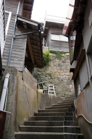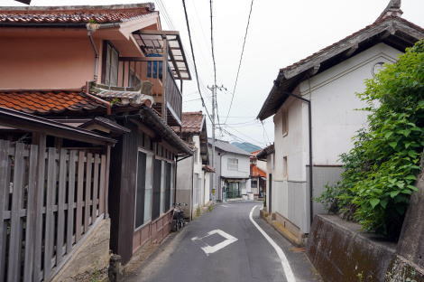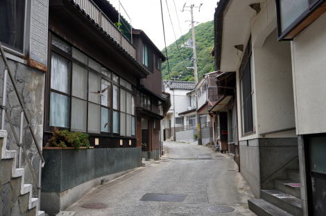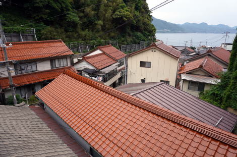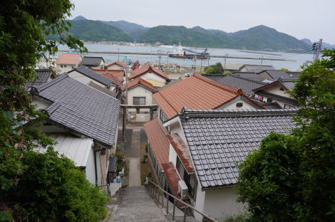 平田の市街地方面からは小さな峠越えはあるが比較的平坦な道のりで、湾奥に突当たったあと東岸をしばらく進むと集落に差し掛かる。平坦な土地はほとんどなく家並は斜面を駆け上がるように形成され、典型的な密集型漁村集落の形を示している。中心となる谷間の道以外は車輛は通行できず階段や急坂で家々が結ばれる。家屋はそれほど古いものではないようだったが赤瓦を中心とした屋根並が見応えを感じる。 南側の少し離れたところにも集落がある。どちらが主体的な集落かはよくわからなかったが、後者は高台に立派な神社があり、鳥居を配した眺めは絵になるものがあった。 |