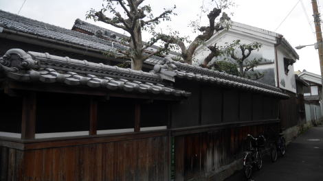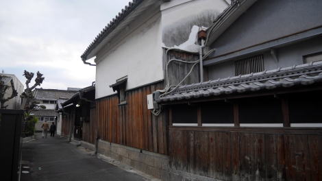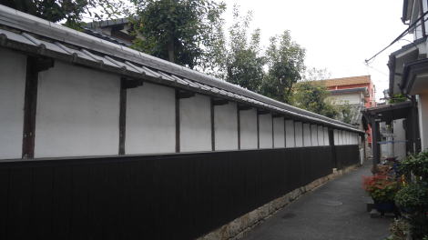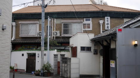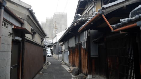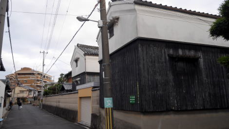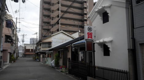 | その最近できた駅であるJRの野江駅を出て西側の一帯、野江三丁目付近は古い佇まいが残るエリアである。地図を見てもそのさまが推測され、周囲は比較的整然とした街路形態である一方、三丁目界隈の特に西側では秩序立ったものが見られず、小路が交錯した様子がうかがえる。事実歩いてみると至る所で路地が派生し、古びた門を持つ旧家や土蔵が散在的ではあるが見られる。西側に向うと、道を挟んで都島区となる方面を見るとマンションなどが林立した風景が隣接していた。ここを境に戦災を免れたに違いない。 地図を見ると、こういった路地が交錯したような地域が上の野江四丁目、成育五丁目にかけても断続的に続いている。基本的には現代の住宅地・商業地となっているものの、土蔵を従えた家屋や長屋風の住宅も見られる。中でも成育五丁目では厳かな塀に囲われた旧家がひときわ異彩を放っていた。少し歩いて大きな通りに出るとファストフード店などが複数見られるような典型的な町の風景が接しており、その対比は激しい。 一角には創業80年という旅館の姿もあった。 |