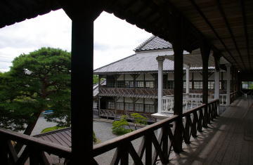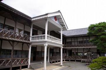 | 宮城県北東部、北上川に沿う登米の町。水運の利を得て商業が発達し、また中世以来城下町として長らく位置づけられていた基盤もある。 教育の面でも先進的な土地であったらしく、この町のシンボルといえる旧登米高等尋常小学校の校舎は明治21年建造、昭和54年まで現役の校舎として使われていた。このような立派な洋風の外観を取入れた学校建築は当時としては斬新極まりないもので、それが今なお残る例は全国でも珍しく、残存するものとしてはベスト3に入るだろう。 中でも中央にあるバルコニーは校舎のどこからでも目立っており、校長がここで外に整列する生徒に向って朝礼を行っていた様子が想像される。 |