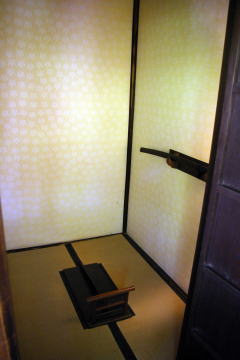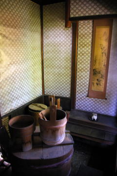 | 風呂場 壁には掛け軸がかかったきわめて風流な浴室である | これは便所である 壁にあるのは刀掛け 武士が泊まることもあったというその名残だという |