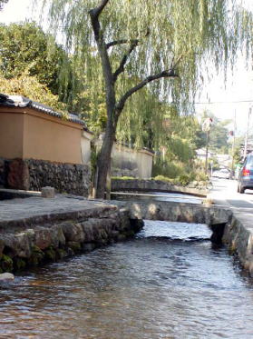 | 現在の上賀茂の町並は、神社境内を流れ下った明神川沿いに、土塀に囲まれた独特の家並が見られる。各家の中庭にはこの川より水が引きいれられている。これは庭園に池を配するためだけでなく、「禊」(みそぎ・けがれを払うために水で身体を洗い清める神事)を行うためでもあった。主屋は流れに面して建ち、緩やかに弧を描く石橋が渡され、優雅な風景を作り出している。 市内中心部の観光地区を外れ、この地区を散策して見るのも趣深い。足を伸ばすとかきつばたの美しい大田神社、沼地植物そして冬鳥の飛来地ともなる深泥池などもあり、そこに至る山裾の家並も落着きがある。 |