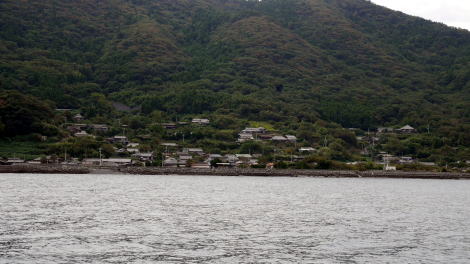 | 海側から集落を遠望する 島の斜面に家々が立地している | |
