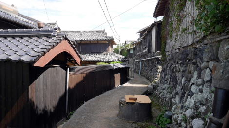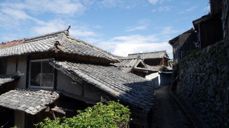 | 八島の集落的な特徴として、家々が海岸線ではなく斜面に立地しているところがまず挙げられる。その点からも漁村ではなく農業を主体としてきたことがわかる。建物の姿も漁家とは全く異なるもので、しかも入母屋屋根などを持つ立派な家屋が多い。斜面は石垣で克服され宅地が整備されているが、見事な石積で先人の苦労が知られる。移民たちは現地で稼いだ金で故郷の島に立派な建てることを夢見てきたのだろう。土蔵を構えている姿こそ見かけなかったが、母屋と農機具等を収納する納屋風の建物を持つ形が多く、中には立派な扉を従えた門を持つ御宅もあった。集落の中を歩いていると小さな島に居るとは思えない感触になる。 集落を見下ろす箇所に2箇所寺があり、訪ねた日はそのうちのひとつで年1度の法要が行われていた。集落や寺の構えは立派なものだったが、探訪中に住民を見たのはほぼその法要に集まった人たちのみであった。明治期には700人ほどの人口があったが、平成27年現在では25人となっており、それもこの10年ほどで半減している。果たして何時まで集落としての命脈が保たれるか。その時はそれほど遠くないのではと思われる。 集落風景として優れたものがあり、個々の建物も保存活用の価値は十分にある。しかし町に財政的なゆとりはないだろうし、国から保存地区として選定されることもなかろう。ここに掲載した風景も失われてしまうことになるのか。せめて集落としての体裁が保たれる間に訪ね、記録しておきたいものだ。 |