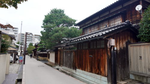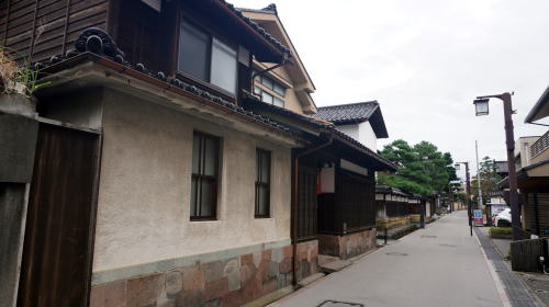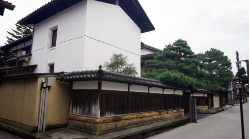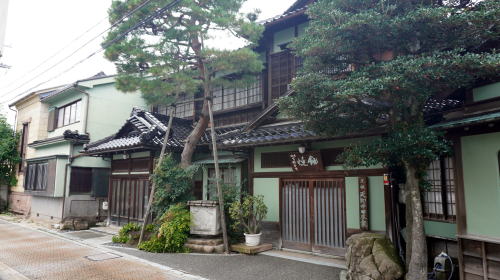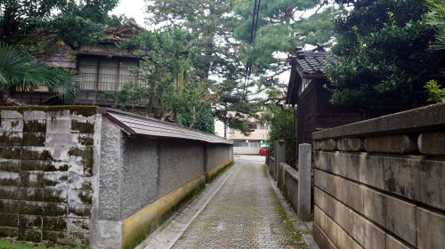 金沢城の周囲特に南側から西側はかつて武士の住まうところで、長町を筆頭に今でもその佇まいを残す区域がある。ここで紹介するのはいずれも小規模ながら藩政期の風情を残している区域である。 犀川右岸からもそれほど離れていない位置に水溜町という一角がある。特徴的なこの町名は犀川を埋立てて造成された町で、水溜と呼ばれる小さな濠があったことに由来するという。金沢城の外周部にあたり、藩主の家臣であった平士の居住地となっていた。 今では武家町としての色彩はあまり感じられないが、緑濃い庭に囲まれた邸宅や土蔵、門などが特徴的で、人通りの多い地区に接しているとは思えない静けさがあった。その中で市の「こまちなみ保存建造物」に指定されている河村家住宅は、武家の建物の特徴を備えたものとして貴重な存在である。また竪町交差点に近い所には明治41年食肉業を創業した老舗「天狗中田本店」の格式ある建物が存在感を高めている。 交差点の辺りは賑やかな界隈で、北西側には若者も多く訪れる竪町の商店街が展開している。ところが一本東側の路地には全く異なる風情の町並が展開していた。この里見町は、加賀藩士であった里見家の屋敷があったことから名づけられたと云われ、享保年間頃までは竪町後丁と呼ばれていたという。今でも立派な塀や門を構えた邸宅が見られ、付近とは明らかに一線を画した町の風景である。新しい家屋も通りに面して土塀風の造りを見せたりと、景観に配慮しているさまが伺えた。 町域の北側は店舗に利用された町家建築などが見られ、地区の特色を活かした町の再形成が図られているようだ。 |