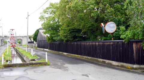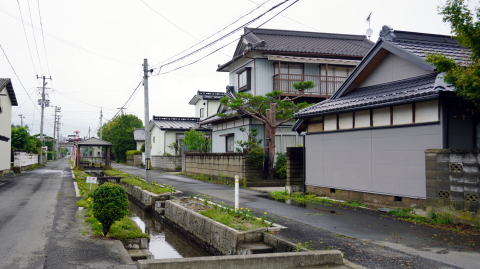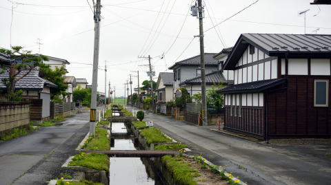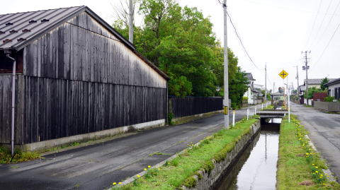 奥羽山脈に源を発し松島湾の外れに注ぐ鳴瀬川は、中下流部で低平な平野部となり穀倉地帯を形成している。 東北本線の鹿島台駅より東に1kmほど、鳴瀬川の右岸に近い辺りにある竹谷地区。地図を見ると一面の水田地帯の中この地区だけ街村的な集落の連なりがあり、特異な印象を抱かせる。訪れて見ると、水路を挟んで両側に家々が建ち並び、特徴のある町並風景が展開していた。 かつてこの付近は木間塚村と呼ばれ、竹谷地区のこの町並は武家町の名残という。慶長5(1600)年、伊達氏の一族であった茂庭氏はこの地から5kmほど北西の松山に入り、木間塚村は同氏の領地となった。鳴瀬川沿いの氾濫原など荒地を開墾し、侍屋敷や足軽屋敷を建設した。その中でこの竹谷には足軽屋敷70軒を構えたという。中心に水路を構え、それに沿い屋敷街を整えたもので、その姿が現在に至るまで残されているのは貴重なものと言えよう。 現在も1kmにわたり大江堀と呼ばれる水路と家並が連なっている。周囲は低湿地帯であり、もともとこの水路が造成されたのは水利というより治水のためと思われる。家々は古いものは少なく、建物から直接歴史を感じることはできないが一部には厳かな門を残す旧家もあった。水路は改修されているものの家並の中央を縦貫し、所々に橋が架かるのみで車社会においては不便な面もある。しかし潰されたり暗渠に改修されず残っているのは、住民の誇りあってのことだろう。水際にあった立看板には、魚巣や深みを設置し魚の生息を考慮し改修を行ったことや、緊急時には防火用水として使用すると書かれていた。 |