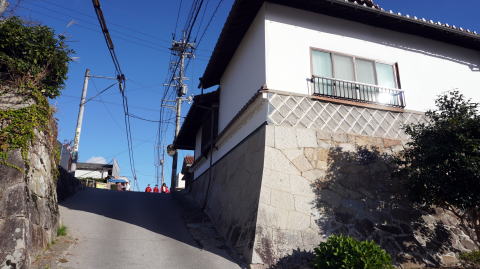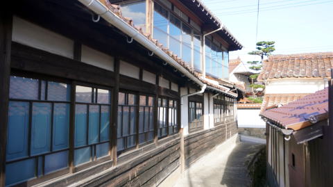 | ■大藤家住宅(1929) 〖登録有形文化財〗 木原家に向う坂道途中にある旧家。主屋は立派な入母屋屋根を持ち、昭和に入って建てられた家屋らしく二階の立ち上がりも高い。 醸造業を代々続けられ、現在の福山市松永地区に多くの得意先があったという。昭和50年代頃に無住になったが、現在一部を修理中。 裏手には江戸期の土蔵がそのまま残り、地下構造の米の炊き口が残るなど、醸造家時代の様子が良く残る。 主屋横の路地も大変風情がある。路地に面するガラス窓もレトロ感が溢れる絵柄だ。 |