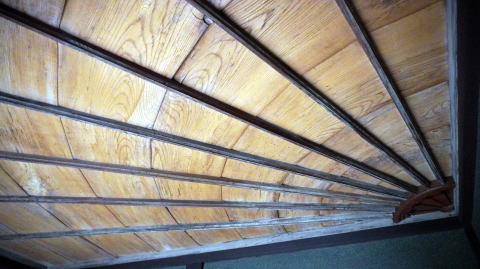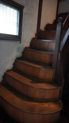 | 二階への階段 こちらも円形加工された板が使われている | |