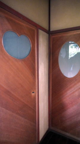 | 渡り廊下の途中に洗面所と浴室の入口がある 半地下の浴室も独特の空間だ 扉の窓の形に遊び心が感じられる | |