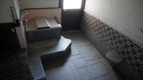 ■伊原家住宅(1917) 〖登録有形文化財〗 伊原家は複数の建物があり、通りを挟んで向き合っている。北側は通称「本伊原」と呼ばれ代々鋳物師をされていた旧家。通りの南側には「岡伊原」と呼ばれた八郎家住宅があり、こちらの内部を見学した。 通りから見上げると特徴的な並び屋根が目につく。これは奈良県橿原市の今井町重要伝統的建造物群保存地区内にある重文今西家住宅を参考にしたともいわれ、この旧家の施主であった伊原正三氏が大工を連れて関西の名建築を見て回り建築を行ったとされ、完成までに二年を費やしたとのこと。 玄関を入ると二間続きの大変豪勢な座敷が目に入り、欄間や床の間などの豪華な意匠、その細部に亘るまで大変見所が多かった。また、二階に上がる階段も円形加工された踏板、擬宝珠の様な意匠など大変手の込んだものであった。 さらに驚くのが中庭とそれに沿った渡り廊下で、太鼓橋をわたると、洗面所と浴室につながる扉がある。その扉も遊び心といったものが感じられ、半地下構造の浴室は床の敷石、壁のタイルが美しく、明り取りの小窓も楕円形でこだわりが感じられる。 最も裏手は一段高くなっており、茶室が設けられていた。 |
