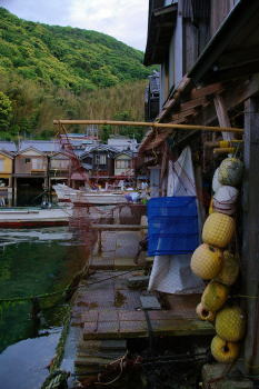 | 丹後半島北東部にある伊根は典型的な漁村集落で、「舟屋の郷」として有名である。NHK朝の連続小説で知られた方も多いだろう。 一番の特徴は複雑に入組んだ湾に沿い、漁船を収納する舟屋が密集していることである。本来それらは単に漁船を収納するだけの施設、漁民は山側の別棟に居住していた。湾の水面を往来し舟屋が各家の玄関の役割を果たしていた。 現在ではその間を道路が縫い、車社会に対応したものとなっているが、山側に主屋、海岸に舟屋という町の形態は変わっていない。 この町を訪ねると、海面がかなり高いのに驚く。このあたりでは干満の差はわずかで、また伊根湾は南に開け、しかもその湾口にある青島は自然の防波堤の役割をしており、日本海側とは到底思えない穏やかな風景が展開している。 ここでは町並紹介ページで載せ切れなかった、漁村の点景や舟屋の情景を紹介したい。 |