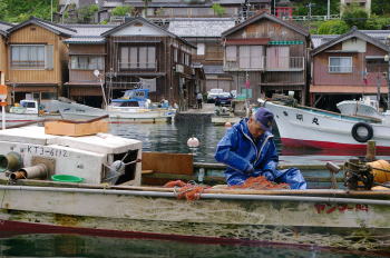 | 朝、漁を終えると船の上で網の繕いを行う。 | |