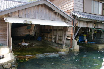 | 舟屋の入口は浪打際で、漁船は内部に収納される。 | 舟屋は海岸に沿うというよりは、海にせり出している。 |