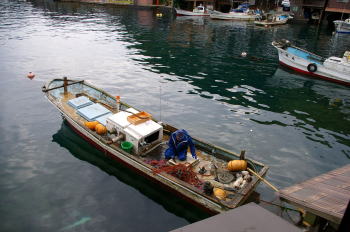 | 近年は漁船の大型化で舟屋に収納できない例が多い。そんな場合は簡素な船着場に結えつける。 | 舟屋の前面の伊根湾はまさに鏡のような静けさだ。 |