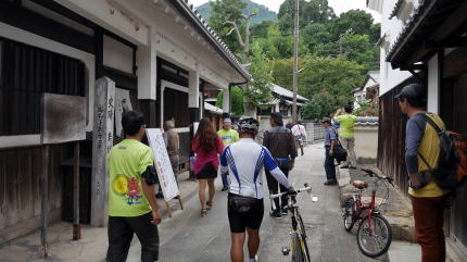 | 自治体主催による本格的なものではなく、地元の有志によるイベントであるらしくささやかであり、またほほえましくなるようで、御手洗らしいイベントだと思った。 遊女屋の遺構である若胡子屋、附近はサイクリングスタイルの人、カメラを持った人、そして地元の人で賑やかだ。若胡子屋の館内では、なつかしの写真展として明治頃の最盛期頃からの貴重な写真が展示されていて思わず見入る。町並でも最も印象的な建物の一つだが、内部は鋼材で補強されている姿が目立つ。躯体の補強のためには仕方ないとはいえ、満身創痍の感はぬぐえない。 |