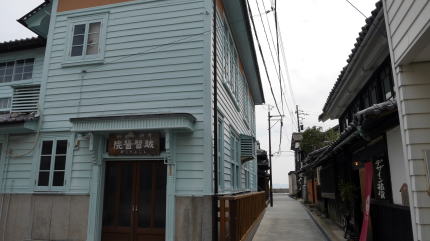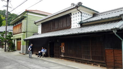 | 私が一番期待していたのがこの町を代表する町家「鞆田家住宅」の特別公開だ。町家の連続する一角や若胡子屋からは少し外れた位置にあり、通りを挟んで洋風の別棟を持つ。 外部から見えるのはこの母屋・別棟だけだが、実は奥行がとても深く離れや茶室、土蔵などを従え、さらには通りを隔てた洋風の外観のもと芝居小屋「乙女座」は、当家が私財を擲って建てたとのことである。幕末から明治にかけて廻船業を営み、金融業にも手を広げて大きく発展した旧家であった。 当住宅は現在でもお住まいのため、残念ながら内部を撮影することはできなかった。しかし細部にも凝った豪勢な造りには驚くばかりだ、公開見学は地元の方の詳しい解説により行われ、参加者一同どよめきが起る場面も多かった。密談時を想定した隠し階段、一方で中庭を望む優雅な茶室など、島の邸宅とは思えない(こう思うのは偏見ですね)豪勢なものだった。 案内された地元の方でさえ内部を詳細に見たことはないとのこと。お住まいのお宅だから当然だろうし、だからこそ我々が訪ねられるというのはとても貴重なことだ。案内を受けているうちに、撮影ができないことなどどうでも良くなってきた。 |