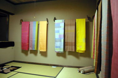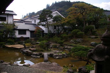 | この催しの中心となるのが旧市街の中央にある入母屋造りの旧家、少し前まで「三楽荘」という屋号で旅館を営んでいた。明治24年建築の母屋、同42年建築の離れを有し、それに囲まれた優雅な中庭を有する。この旧家は最初に訪ねた時から何度も目にしているが、内部を見学するのは初めてであった。一般にこのような商家建築は、表通りから見るのとは想像できないほどの奥行の広がり、豪勢さが隠されていることが多く、ここもその例に漏れなかった。多くの客室、広間からは中庭が見下ろされる。 公開された当日、芸術品の展示、さらに客室や広間が昼食会場として使われ、会席料理などを味わう探訪者の姿もあった。 |