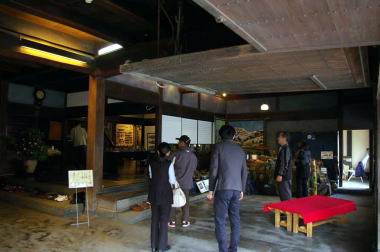 | 見学する参加者 広い土間がもと商家を物語るが 今参加者が立っている辺りには帳場があったという 上部には跳ね上げられた大戸が見える | |