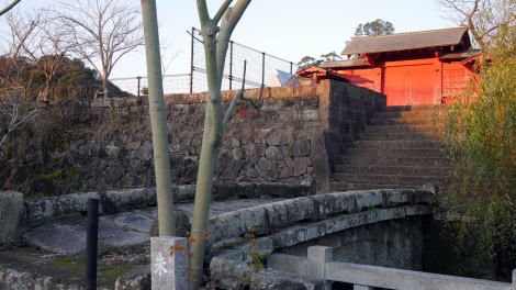 | 旧国分城跡の石垣と朱門 南側には外城集落の名残が見られる | |
