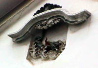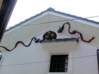 | 土蔵梁隠しに施された鏝絵 | これは珍しい部類に入るでしょう。取り付けてあるように見えますが近づくと紛れもない鏝絵でした。大蛇が何か獲物に群がっている絵を表現したものなのか。 | |
