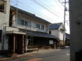材木商、小城家。一階部も改造されず格子などが配置されたままで、風格を感じます。妻部を改修中でした。 |