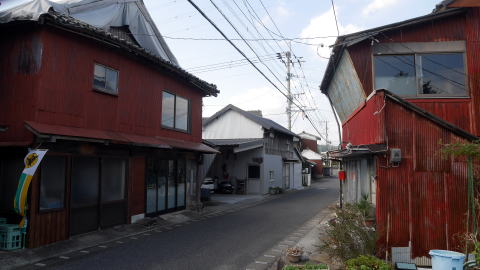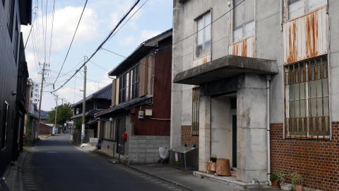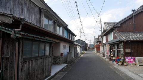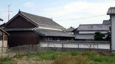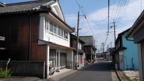 武蔵町は国東半島の南東部、大分空港のある町で周囲の道路も整備され、それらを通過するだけでは古い姿が存在しているとは思えない風景が展開している。 古くから集落が発達したのは武蔵川下流左岸付近で、ここには古市と今市という杵築藩の在町が置かれていた。現在、半島海岸部を周回する国道から県道55号に入っていく辺りに公共施設や商店が集まり、新市街地を形成している一方、この川沿いの界隈は昔のままの道幅で、家並も古びている。 この一帯は七島筵・七島藺(い草)と呼ばれる筵・畳表の生産が盛んで、古市・今市はその積出によって賑わった。海運業者も現れ、豪商も生れた。杵築城下に休息屋敷を持つことを許された郷町人もあったという。商域は瀬戸内各地のほか山陰方面にも及び、石見国浜田の廻船問屋清水屋の客船帳には江戸中期から明治にかけ古市から5隻、武蔵から9隻の船が入港したとの記録がある。 明治以降も七島藺のほか米・麦などの農業が盛んで、昭和戦後になっても七島藺の移出量4万束弱(昭和34年)との記録がある。 国道から川沿いの旧道に入ると俄かに道幅が狭まり、周囲の現代的な様子との対比が今となっては滑稽な感もある。妻入り・平入の混在する家並は所々更地になっているものの、在郷商業町に発祥する歴史のある町であることが伝わってくる。劇場か映画館を思わせるような建物もあった。街路から少し外れた所には廃棄されて植生に覆われているのが痛ましいものの、大変立派な屋根を持つ邸も見られた。 |