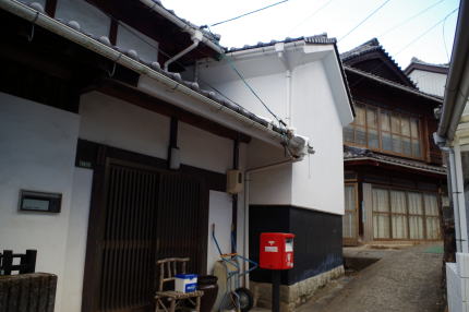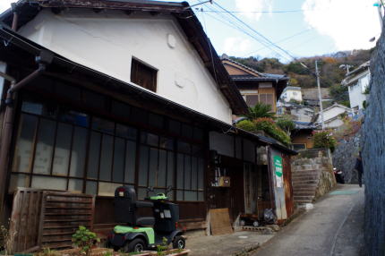現在の呉市中心より東側に山を一つ隔てた阿賀地区は、川を挟んだ東側の広地区に挟まれてやや地味な印象である。最近になって市街地へ抜けるトンネルが整備され、国道は交通量が非常に多い。 平地に乏しく、北側は斜面をかけ上げるように宅地が造成され、南側はかつての海岸線に沿って細長く集落が展開する。現在安芸阿賀駅のあるあたりから南側は埋立てによって造成された土地である。 ここで紹介するのは地区の南端に位置する阿賀南8丁目の風景である。地元では大入地区と呼ばれており、バス停や公共施設にもその名がある。休山・高烏山などの山地が半島をなし、この地区を含む東岸一帯は山が海に迫り、僅かな平地を求めて集落が立地している。 海岸のバス通り沿いにある駐在所付近から延びていく街路がメインのようで、家々はやや大柄で商家風の建物も見られた。街路といっても軽自動車がようやく通れるほどの幅でしかない。斜面を工夫して宅地化しようと石垣が多用され、母屋は派生する路地に面しており街路には土蔵のみが接するなど、様々なそして複雑な建て方が見られる。 一段高いところへは階段が通じ、そこから等高線に沿うような形で路地が巡りまた新たな家並がある。そういったところにも木造三階も一部見られるなど、零細な漁村ではない様子に見えた。地区の詳細な歴史は今一つ判らないが、何らかの産業が発達していたのではと思われた。 |