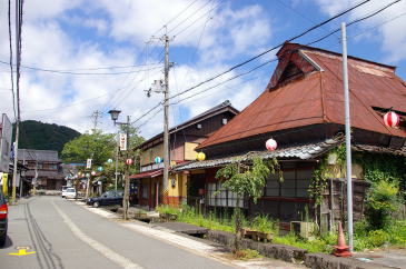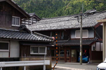 朽木の中心集落・市場には古くから町が開けていたらしい色が感じられ、平入りの町家建築や一部には茅葺の旧家も見られる。町並は一本道に沿い連なり、幾度か直角に折れ曲ってもいるため宿場町の様相である。しかしここに宿駅が設けられたということは明確に記録されていない。或いは幾ばくかの旅籠などはあったのかもしれないが、日本海の海産物をいち早く都に運ぼうとする街路であったため、泊地としては発達しなかったのだろう。 産業としては中世から続く林業があり、安曇川の水運により琵琶湖沿岸に運び込まれた。今に残る伝統的な家々の主なものは商家や問屋に源を発するものであり、旅籠や茶屋などよりも在郷商業町としての賑わいが大きかったものと思われる。商業の興りは室町時代後期までその記録が残っており、当時既に市場には米や魚などを扱う17軒の商家があったとの記録があり、江戸から明治にかけてはそれらの他炭や桶・傘・豆腐などを商う家々が多く、また医者や質屋などもあったという。今でもその名残として象徴的なのが角地に建つ3階建ての洋風建築・旧「丸八百貨店」である。ここが周辺地域の中心として賑っていたことがわかる。登録文化財となっており、内部は公開され売店や喫茶店などとして利用されていた。 |