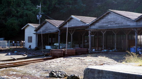 舞鶴市田井地区は市域の北東、若狭湾に向けて突出した半島東岸に位置し北東側に開けた入江に面し、北側の半島先端付近の成生地区と同様昔ながらの漁村の形態を残している。古くからブリの水揚げが盛んで、初ブリは領主に献上されていたという。 江戸期は丹後国加佐郡に属し田辺藩領で、漁業を主としながら農業も行われ、柿や胡麻、綿などが運上(物品で納める税のようなもの)に挙げられており、このあたりの構成も成生集落と共通している。 明治期の物産記録ではブリ200本、烏賊1000貫、竹1万本、薪1万貫とあり、それらは舞鶴の市街をはじめ宮津、若狭小浜などに船で運ばれ出荷された。 集落付近は狭いながらも平地が展開しており、比較的家々の建て方に余裕があるように感じる。家並の間に土蔵、小さな祠などが見られ、中でも特徴的なのが港に接して舟屋が建ち並んでいることだ。しかも成生地区とは異なり駐車場などに転化せず一部には今も漁船が置かれ、現役として使用されている様子だった。 |