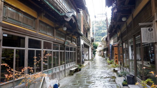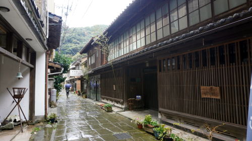 | 江戸時代に入っても松江藩の重要な港津として藩経済に欠かすことのできない商港であった。捕鯨業も盛んに行われたほか、西回り航路の寄港地として大きな繁栄をみたことで、町は最盛期を迎えた。かつての史実によると、「出入船千艘、港内は帆柱林立し船問屋は40数軒を数え、取引高は五万両(時価75億円)となり、船人たちは柳眉細腰の美人に迎へられ紡歌は昼夜を別たず情緒綿綿、縞の財布が空となるを知らざりき」と記されている。 明治以降、漸次対岸の境港に港町としての地位を奪われていった。 半島の先端付近という不便な位置にありながら、美保神社を中心に訪れる客も多い。かつては出雲大社のみを参拝するのは片参りといわれ、美保神社も同時に参ることが習わしとなっていたといい、かなりの賑わいであった。門前近くの路地に立派な石畳が敷かれているのもそれを象徴しているようで、古くは徳川時代に発祥したもので、修繕を繰り返しながら保たれている。雨に濡れると青味がかって見えることから青石畳通りとして親しまれ、付近には老舗旅館の姿もある。この辺りが町の繁栄を最も感じることが出来る地区だ。 緩やかに弧を描く湾の海岸に沿い小路は長々と延び、次第に小規模な木造の家々の密集に変化する。それらはかつての廻船問屋、商家や宿屋などが含まれ、古い町並を残している。所々に旧家のいわれを示した説明板があり、探訪中に豆知識を与えてくれる。 |