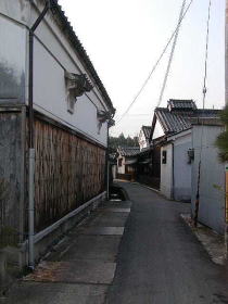 | 造り酒屋もあります。味(うま)酒が三輪にかかる枕詞であることが地名の由来ともいわれ、古くから酒所でもあったのでしょう。酒造りには清い水が不可欠です。山裾に位置するこの土地は伏流水などに恵まれていそうな地形です。 | 土蔵のある路地 |