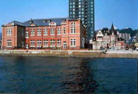 波止場より眺める旧門司税関(M45建築)右側奥に小さく見える洋風建築は国際友好図書館。門司を代表する町並風景ですが、背後に無機質に聳える観光タワーが景観を乱しています。 |