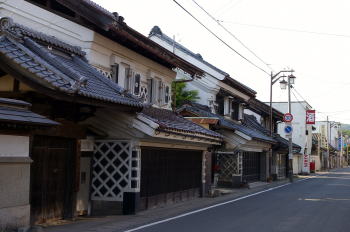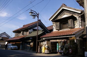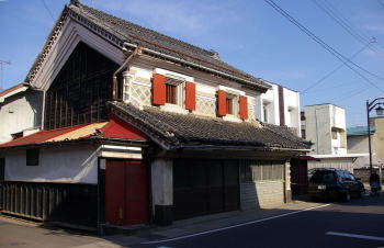 | 店蔵が連続する町並 | 二階の扉に分厚い漆喰の代りとして鉄板を使用した町家。それも赤銅色であるため派手さを感じる。 |