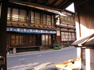 | 下町は街路が狭く、間口が狭い町家が連なります。 | 中町の緩やかな曲線を描く旧街道。右側中央に牛馬を手配していた元下問屋の建物(現・民宿伊勢屋)が見えます。 |