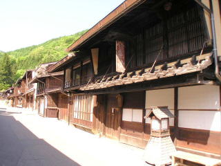 奈良井の民家の特徴の一つに猿頭がある。これは軒庇を2階部分から吊る構造にした独特なもので(左の写真参照)、盗人がよじ登るとずり落ちるわざと脆弱なつくりにしていると聞く。その他木曾路一般に見られる出梁造りの他、北陸地方などと外見が共通する形の袖卯建、中には跳ね上げ式の蔀戸を備えた家もあった。これらは木材の豊富な木曾の特性と、漆器業をはじめとした産業の繁栄の産物だろう。町家の表情も一軒一軒異なり、それらの表情を細見することによって、より興味深い探訪となる。 |